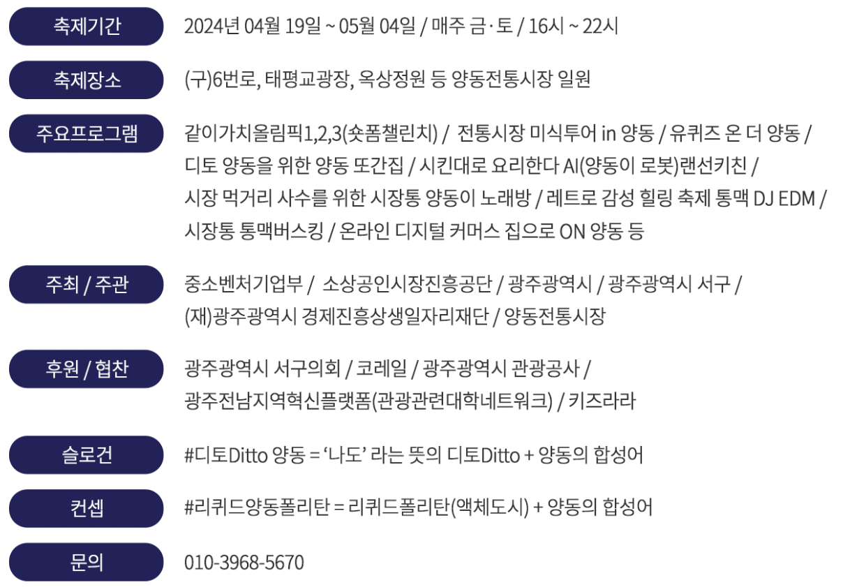 2024년 4월 19일부터 5월 4일까지 광주광역시 서구 양동전통시장에서 열리는 양동통맥축제는 호남 최대, 최소 도소매 전통시장인 양동전통시장에서 개최된다고 합니다. 이번축제의 이벤트와 행사일정을 알아보도록 하겠습니다.